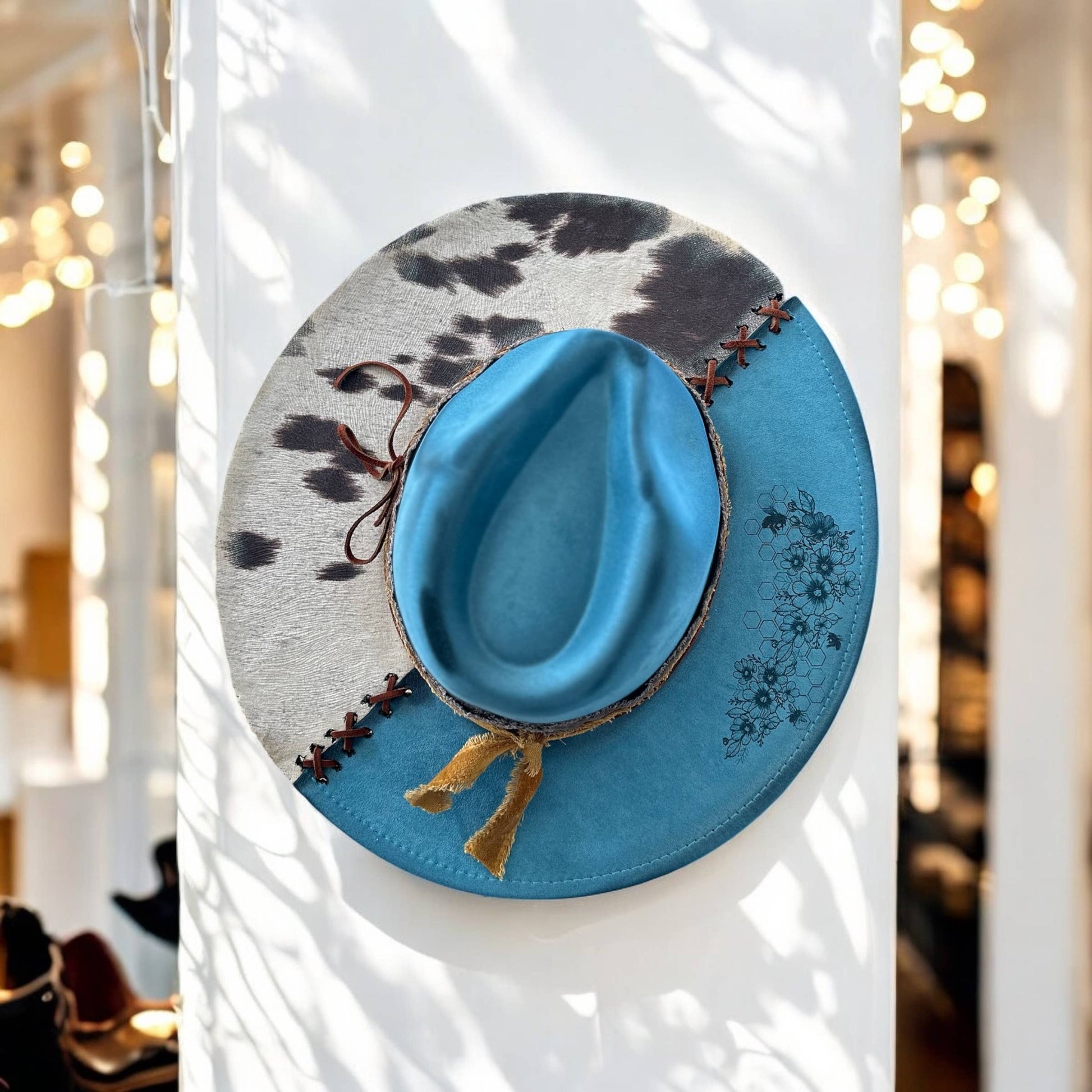 Gorgeous cowhide print fabric. Beautiful blue rancher is a universal, adjustable fit. Features a pretty bee design on the brim. All accessories included exactly as shown in the photos.