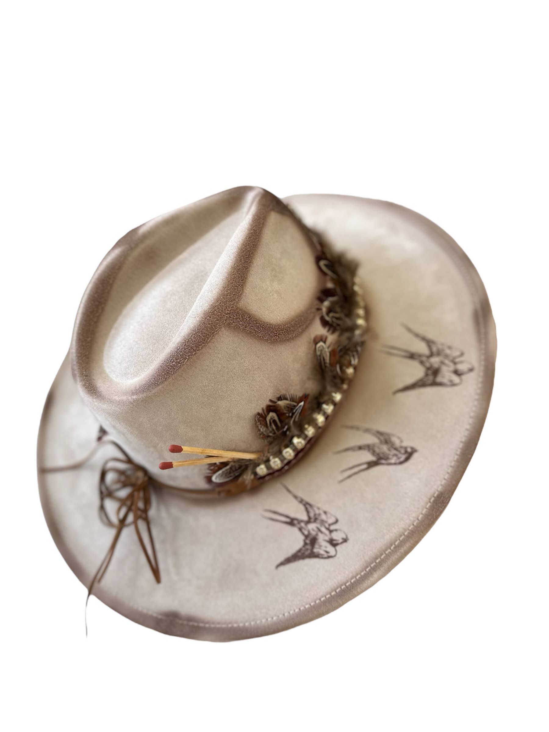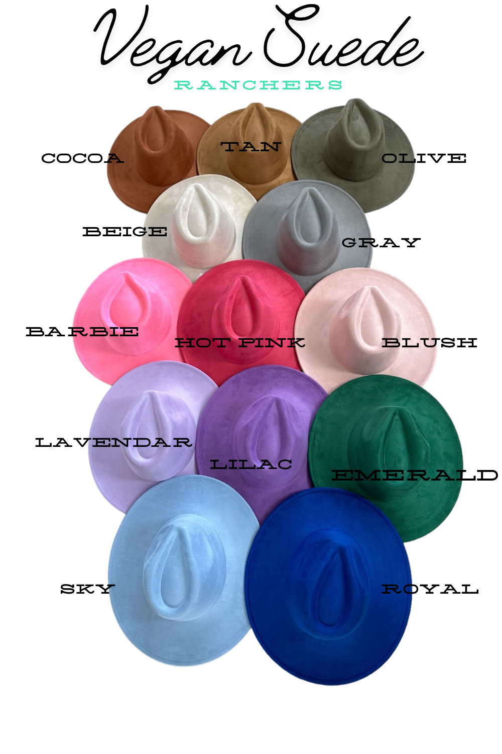 The fully decorated hat is our beige vegan suede rancher. Includes every as shown in photos.
